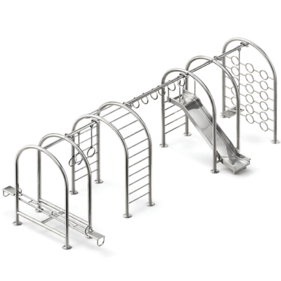 Equipamento produzido a partir de cortes a laser de tubos e chapas em aço inox 304 polido, sob dimensões de Ø2½, Ø2, Ø1½ e chapa 3/16, articulações com rolamentos em aço inox, sua estrutura principal é de madeira de lei Garapa com certificação IBAMA, tem como principal característica sua resistência a intempéries e com gravações routeadas de acordo com o cliente, individualizando e agregando ainda mais ao equipamento. Permite a utilização de até 2 usuários ao mesmo tempo.